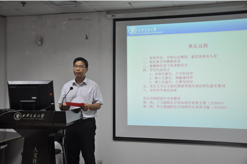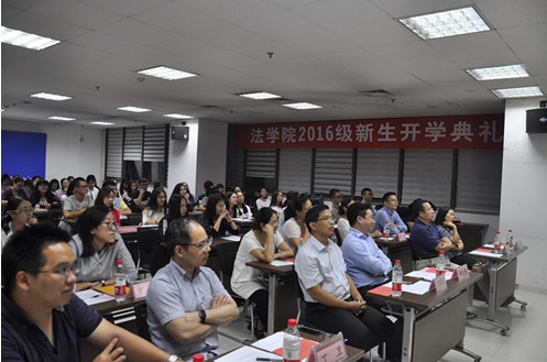 9月18日晚,球友会官网_球友会平台(中国)2016级新生开学典礼在主E703隆重举行。院长单文华教授,党总支书记王保民教授,副院长李万强教授,副院长丁卫副教授,院长助理吉兰湘老师和苏金远教授,院工会主席张弘副教授,文治书院院务副主任郭小平老师,院办主任张美萍老师,法学复合51班班主任薛华、唐学亮老师,法学61班班主任王玉苹、卞苏老师以及全体2016级本科、硕士、博士生新生参加了开学典礼,会议由学院学生工作专职委员张乃钟老师主持。