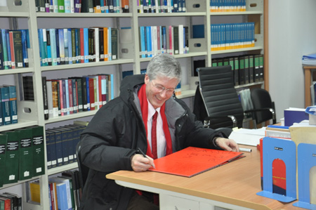 报告后,Rolf Fife司长来到球友会官网_球友会平台(中国)。球友会官网_球友会平台(中国)院长单文华教授会见了Rolf Fife司长,并带领他参观了学院文化大厅和丝绸之路国际法与比较法研究所。Rolf Fife司长对研究所的研究条件赞不绝口。他在嘉宾册上写下感想,希望研究所成为国际交流的桥梁,并祝愿中挪友谊健康发展。随后,他和研究人员合影留念。