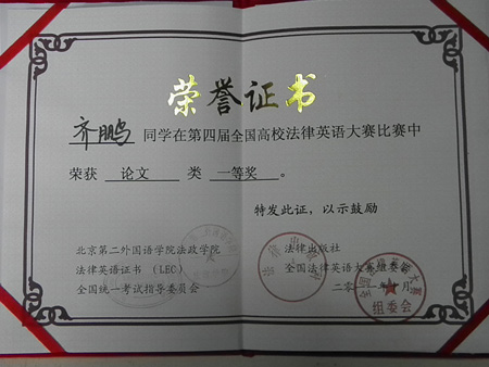 此次比赛吸引了来自北京大学、上海交通大学、中国政法大学、华东政法大学等近70多所高校球友会官网_球友会平台(中国)的选手参加,大会主办方特别邀请了国务院法制办原主任孙婉钟先生以及来自中国社会科学院法学所、中国人民大学球友会官网_球友会平台(中国)等多家高校和研究机构的法律英语专家、教授担纲评委。我院齐鹏同学撰写的英语论文《National Treatment Principle For China's Bilateral Investment In The New Period》在此次大赛中经过激烈角逐荣获国家一等奖,是此次参赛西北地区唯一获得等级奖的论文。