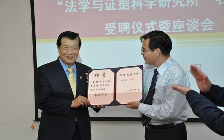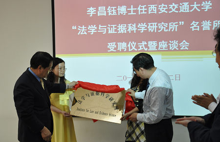 10时整,李博士的受聘我校“法学与证据科学研究所”(ILES,“法证据所”)名誉所长仪式在主楼E910会议室隆重举行。仪式由球友会官网_球友会平台(中国)院长单文华教授主持。徐宗本副校长、国际处梁莉处长、球友会官网_球友会平台(中国)党委书记彭沪生、ILES所长李生斌教授和马治国教授以及球友会官网_球友会平台(中国)王保民副院长出席了仪式。在热烈的掌声中,徐宗本副校长代表学校向李昌钰博士颁发了聘书,并同李博士一起为我校“法学与证据科学研究所”揭牌。李昌钰博士将一条美国康州警政厅的警官领带赠与徐宗本副校长,他还向在场的其它几位学院领导赠送了礼物。徐副校长发表了热情洋溢的讲话,他首先对李博士的访问表示感谢,并对李博士的受聘表示祝贺,希望李博士能把他的真知灼见,经验智慧传授给我校广大师生。他指出,“事是靠人做出来的”,希望在李博士的指导和支持下,球友会官网_球友会平台(中国)和医学院法医学科充分发挥各自优势,把“法学与证据科学”这个新兴的交叉学科做好做强。李博士也发表了热情洋溢的讲话。他首先以DNA立法为例,充分肯定了法学与法医学开展学科合作,成立法学与证据科学研究所的重要意义。他指出当代科学研究的发展已经把两个学科紧密地联系在一起,法学和法医携手开展证据科学等交叉学科研究,是两个学科保持前沿性,培植学科新增长点的重要举措。他表示,“能够担任贵所所长是我的荣幸”。他说,“很多地方想以我的名字命名成立研究所等,但我都拒绝了。我想,以人的名字命名很容易,但一个人要想真正做点事却很难。就像生小孩一样,要培养他,让他健康成长,所以,我以后会尽力为大家做好服务,也欢迎大家到美国,到我的学校来。”随后,李教授与球友会官网_球友会平台(中国)师生进行一场以“法学与证据科学”为主题的座谈会。座谈会上,李博士幽默风趣,侃侃而谈。老师和同学们踊跃发言,与李博士的讨论热烈而有趣。最后,单文华院长作了总结发言。老师和同学们意犹未尽,都觉得学到了很多书本上没有的知识。