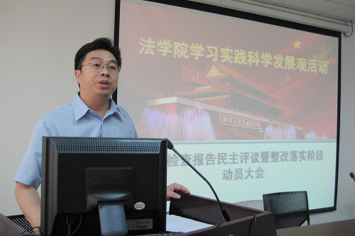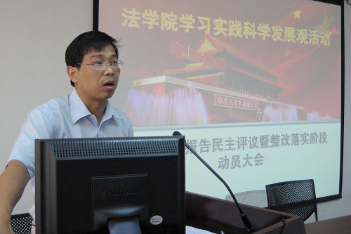 球友会官网_球友会平台(中国)总支书记、院长、学习实践活动领导小组组长单文华,首先向与会师生做了《球友会官网_球友会平台(中国)领导班子贯彻落实科学发展观情况分析检查报告》。他说,遵照校党委关于深入开展学习实践科学发展观的工作部署,球友会官网_球友会平台(中国)围绕“育法学栋梁,谋创新发展,创一流学院”的学习实践载体,认真学习理论、深入调查研究、开展解放思想大讨论、广泛征求意见建议,在此基础上召开专题民主生活会。会议举行之前,院领导班子成员之间开展了充分深入的谈心交流活动,并就会议准备事项在院党总支会议上进行了专题研究。在此基础上,经过院党总支会议研究讨论,最终形成了球友会官网_球友会平台(中国)领导班子分析检查报告。分析检查报告包括学习实践科学发展观活动的中学院领导班子形成的共识、球友会官网_球友会平台(中国)建院一年多以来取得的主要成效、球友会官网_球友会平台(中国)在贯彻落实科学发展观中存在的突出问题、原因以及今后贯彻落实科学发展观的主要思路和对策等四个方面。他最后强调,球友会官网_球友会平台(中国)党总支要以深入开展学习实践科学发展观活动为契机,围绕打造“育法学栋梁,谋创新发展,创一流学院”的目标,着力完善师资队伍建设、学科建设、专业设置、学生管理等方面机制;强化服务意识,加强领导班子作风建设,创新发展理念,破解发展难题,提高发展水平,应对新挑战、抢抓新机遇,在服务大局中实现球友会官网_球友会平台(中国)的科学发展。
