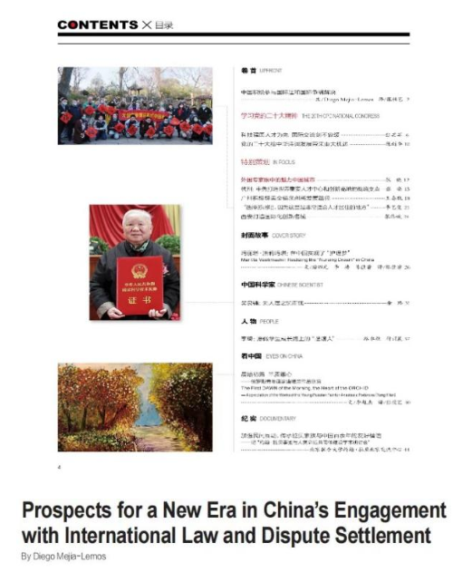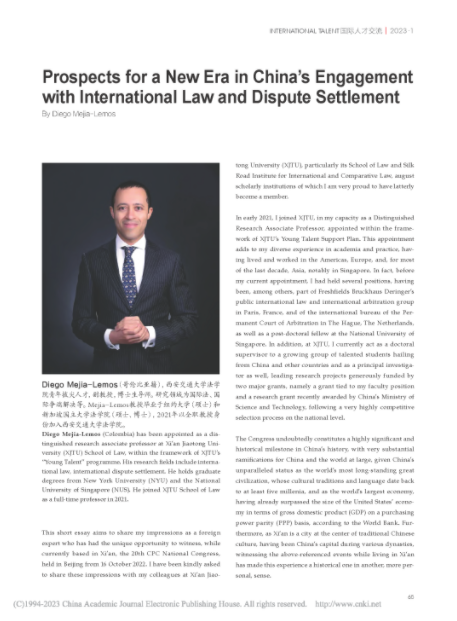 日前,我院青年拔尖人才、球友会官网_球友会平台(中国)副教授Diego Mejía-Lemos以“Prospects for a New Era in China's Engagement with International Law and Dispute Settlement”(中国积极参与国际法和国际争端解决)为题在《国际人才交流》2023年第1期发表文章,分享他对习近平总书记在中国共产党第二十次全国代表大会上所作报告的感想,文章被作为该期“卷首”进行推介。