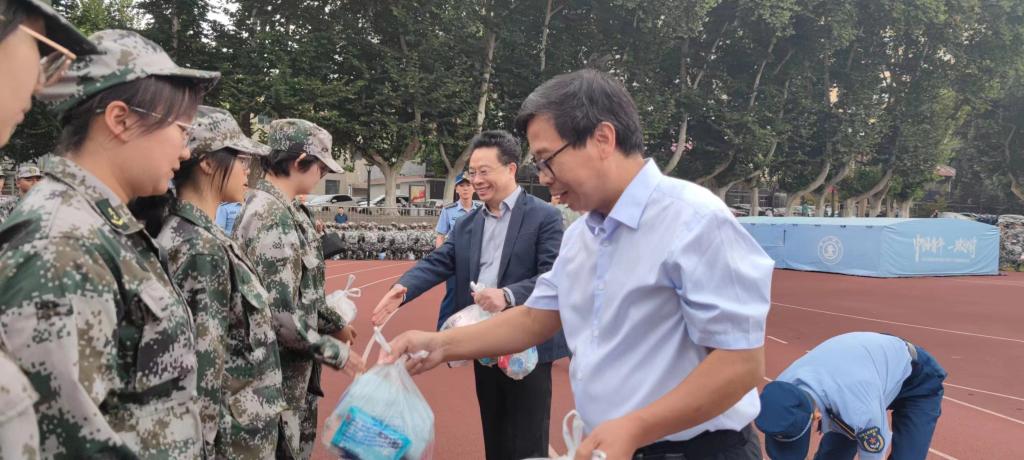之后,单文华院长和王保民书记一起为教官、指导员和同学们送上“慰问大礼包”,逐一将慰问品送到教官、指导员和同学们的手中,给炎炎夏日带来缕缕清凉。