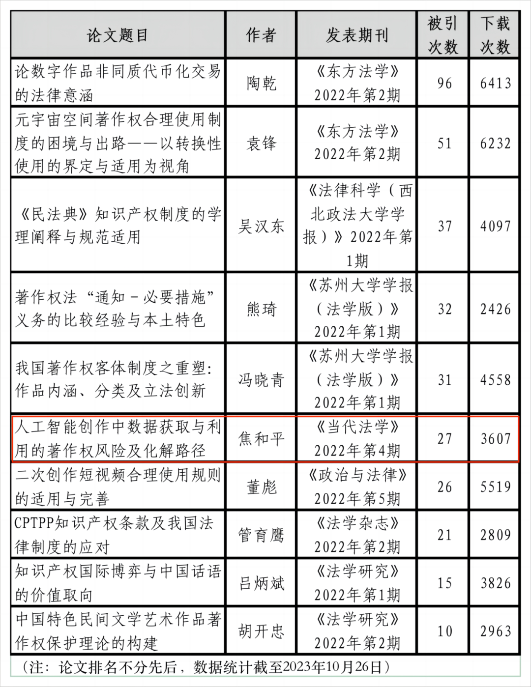 2023年11月10日,中国人民大学国家版权贸易基地公布了“2022年度著作权热点问题研究十佳论文”。球友会官网_球友会平台(中国)球友会官网_球友会平台(中国)教授、博士生导师焦和平发表于《当代法学》2022年第4期的《人工智能创作中数据获取与利用的著作权风险及化解路径》入选十佳论文。