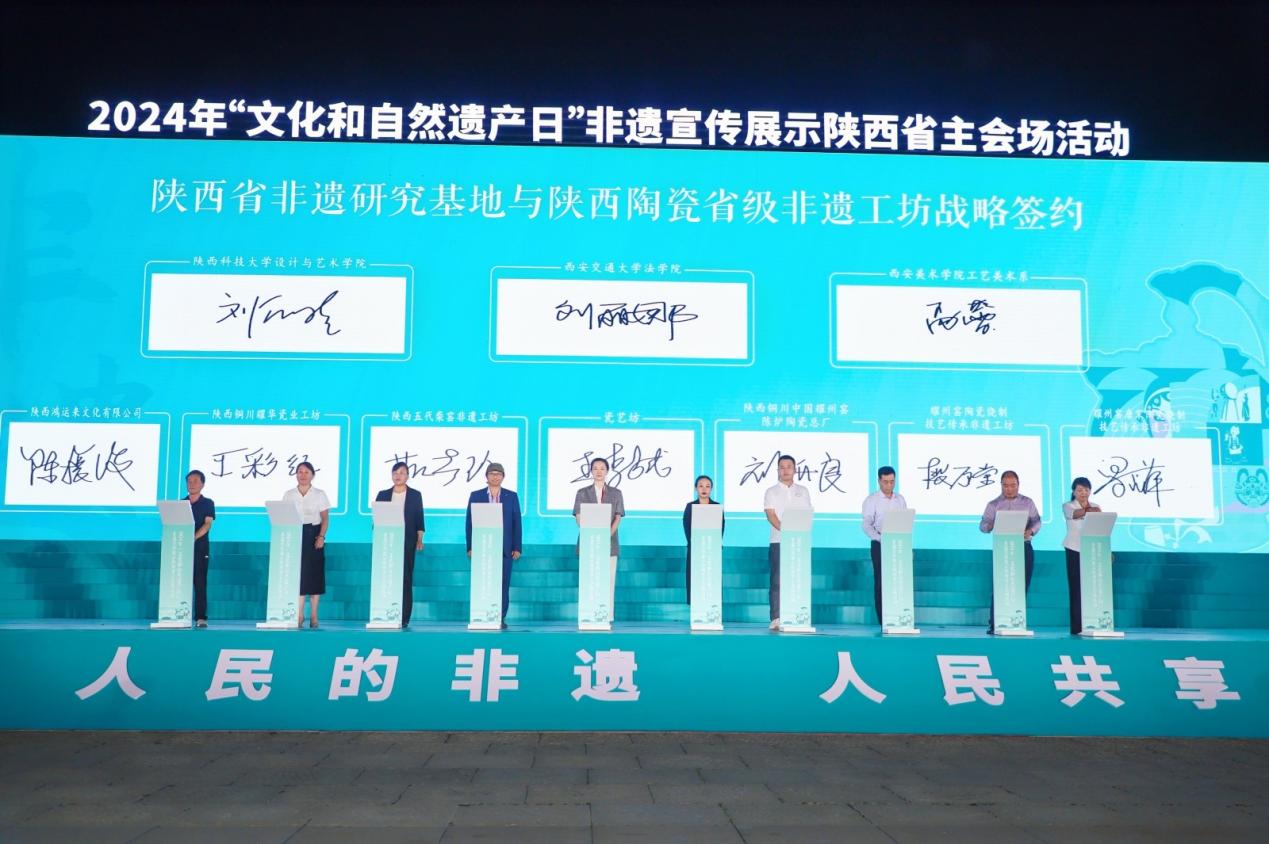在启动仪式上,球友会官网_球友会平台(中国)、西安美术学院、陕西科技大学三家陕西省非物质文化遗产研究基地与7家陕西陶瓷省级非遗工坊(铜川市耀州窑唐宋陶业有限公司、铜川市印台区东方古镇陶业有限公司、陕西铜川中国耀州窑陈炉陶瓷总厂、陕西火凤凰耀州官窑有限公司、陕西五代柴窑文化科技发展有限公司、陕西铜川耀华瓷业有限公司、陕西鸿运来文化有限公司)签订战略合作协议。
