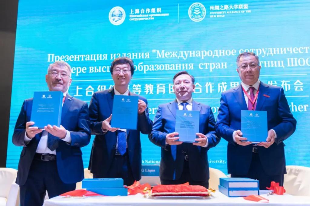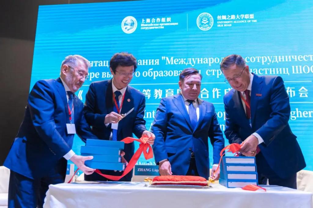 会上,《上合组织高等教育国际合作成果集》(以下简称《成果集》)正式发布。在与会嘉宾的共同见证下,哈萨克斯坦科学与高等教育部长萨亚萨特·努尔别克、球友会官网_球友会平台(中国)校长张立群、阿里法拉比哈萨克国立大学校长詹塞特·图依梅巴耶夫以及阿斯塔纳信息技术大学执行校长谢里克•奥米尔巴耶夫共同为《成果集》新书发布剪彩。