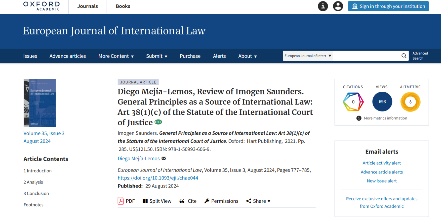 Secondly, as a result of research conducted during the Visiting Research Professorship, an essay reviewing a book on general principles of law and discussing the impact of AI on the ascertainment of that formal source, among other issues, was commissioned by and accepted for publication in theEuropean Journal of International Law(EJIL). The EJIL is indexed by the Social Sciences Citation Index (SSCI) and currently ranked globally as a SSCI Quartile 1 (Q1) academic journal. The essay has appeared inEJIL's volume 35, issue 3, and its online version is available for free downloading at:https://academic.oup.com/ejil/article/35/3/777/7745476