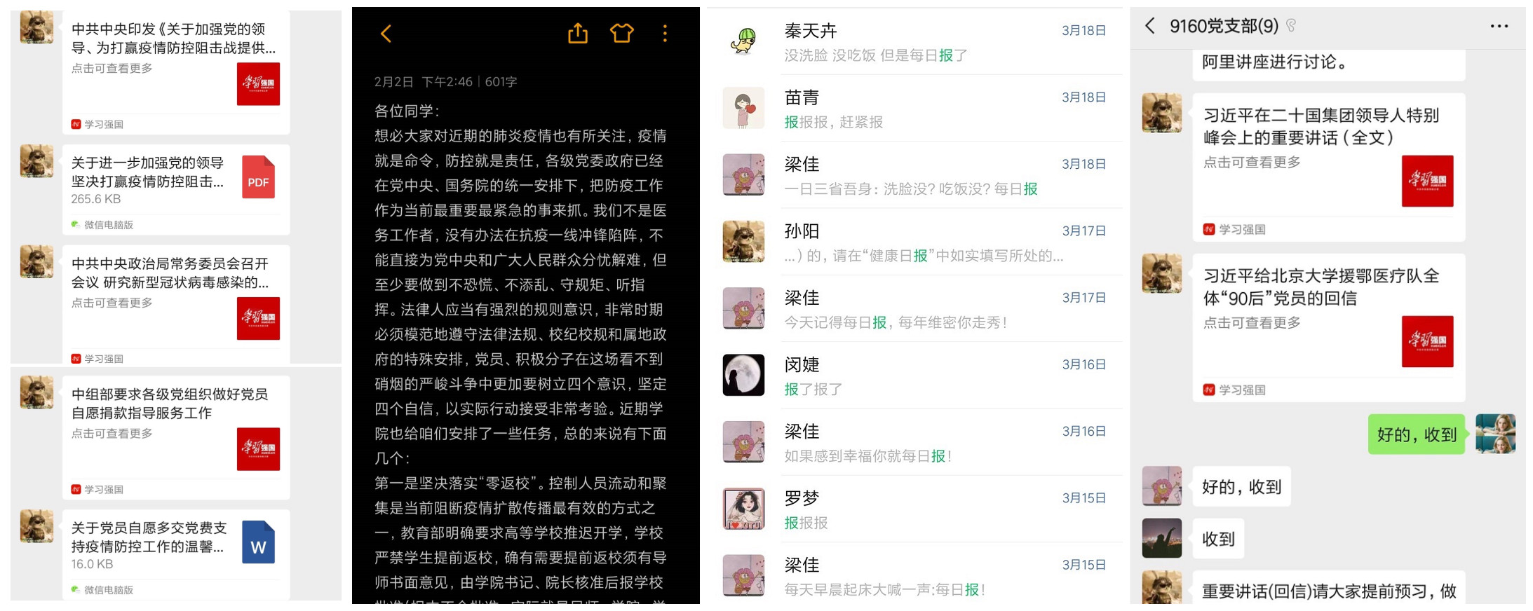 “马克思主义立场、观点、方法是我们战胜一切困难的思想武器,总书记的重要指示是我们抗击疫情的行动指南”,支部组织委员朱玉彤表示,“居家防控依然要加强政治理论学习,开好组织生活会。”战疫期间,支部通过学习强国、微信群第一时间转发习近平总书记重要指示和上级重要文件,督促党员自我学习,并且在两次组织生活会上集中研究讨论、交流学习心得,确保全体党员理论知识上入脑、有收获,政治思想上入心、受洗礼,进一步增强“四个意识”、坚定“四个自信”、坚决做到“两个维护”,在思想上行动上同党中央保持高度一致。