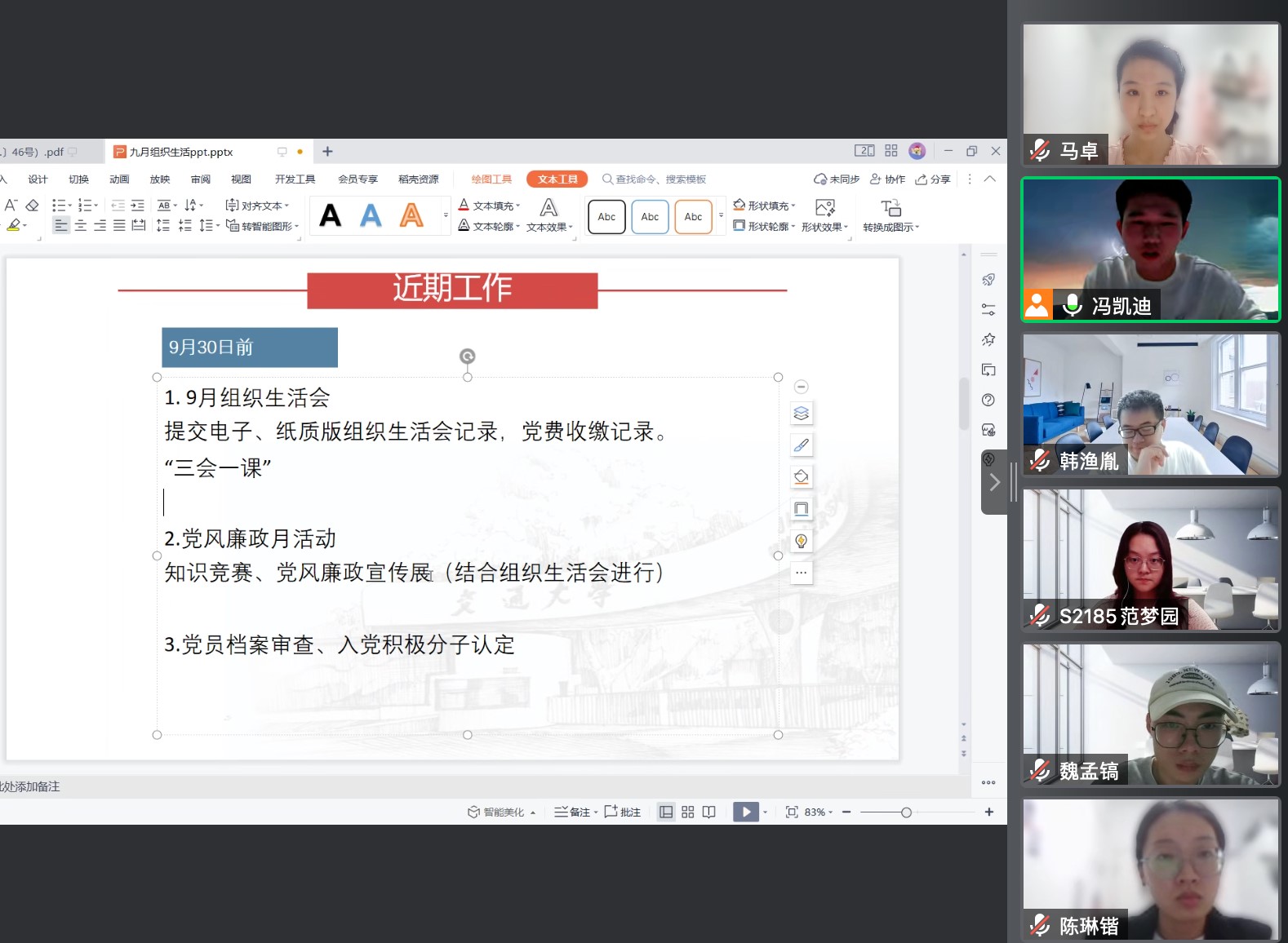 2022年9月27日晚,球友会官网_球友会平台(中国)硕2185党支部举行了九月组织生活会,也是本支部的第一次会议。根据疫情防控相关要求,本次组织生活会采用线上的方式进行。本次会议由党支部书记冯凯迪主持,党员及入党积极分子共15人参加会议。