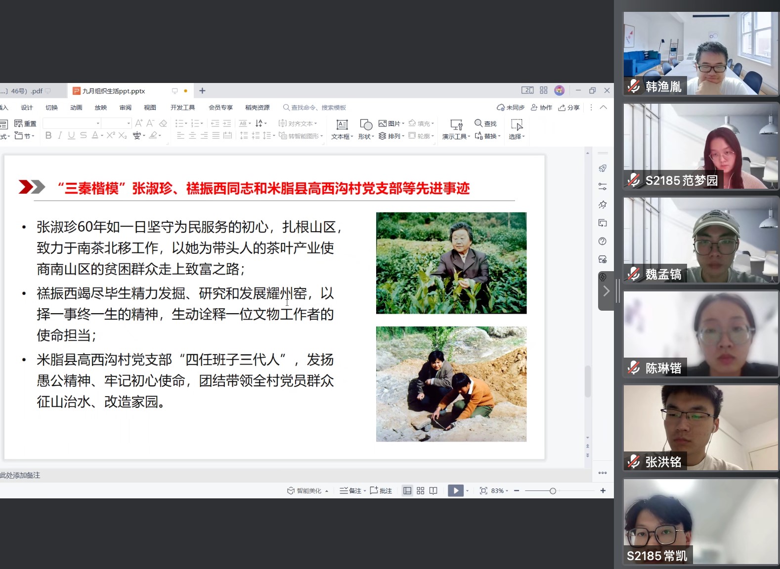 随后,支部宣传委员马卓同志带领大家学习了“三秦楷模”张淑珍、禚振西同志和米脂县高西沟村党支部等先进事迹。张淑珍60年如一日坚守为民服务的初心,扎根山区,致力于南茶北移工作,以她为带头人的茶叶产业使商南山区的贫困群众走上致富之路;禚振西竭尽毕生精力发掘、研究和发展耀州窑,以择一事终一生的精神,生动诠释一位文物工作者的使命担当;米脂县高西沟村党支部“四任班子三代人”,发扬愚公精神、牢记初心使命,团结带领全村党员群众征山治水、改造家园。每一位榜样身上都闪耀着精神之光,每一个楷模都以自己的力量推动了时代发展。作为共产党员,要学习他们对党忠诚、坚守信念的政治本色,始终保持为党和人民事业奋斗的初心初衷和应有定力,做习近平新时代中国特色社会主义思想的坚定信仰者和忠诚实践者。